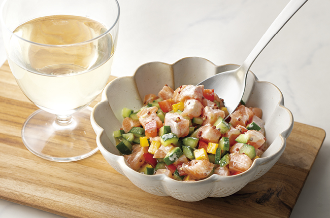上質なアトランティックサーモンの魅力を、今回は火を通さず“和える”ことで引き出した一皿をご紹介します。脂のりがよくクセのないサーモンに合わせるのは、卵の黄身だけを使ったまろやかなマヨネーズ。全卵マヨネーズよりもコクと旨みが際立ちつつ、あえて酸味を抑えたシンプルな味わいが、サーモン本来の甘みやとろけるような食感をしっかりと引き立てます。そこにパプリカなどのカラフルな野菜を加えれば、食感も彩りも豊かになりますよ。さらに、やわらかい果実味と軽やかな酸味をもつ白ワインと合わせるのもおすすめ。爽やかな風味が、サーモンの脂とマヨネーズのコクを上品に引き立ててくれます。軽やかに楽しむ白ワインのおともに、シンプルだけど贅沢な一品を、ぜひご自宅でお楽しみください。