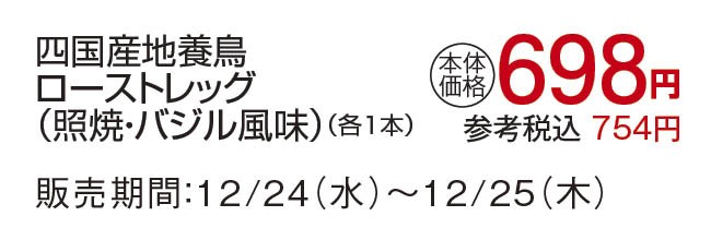 豊かな自然の中で育った「四国産地養鳥」を使用したローストレッグは、クリスマスの夜にふさわしい、とっておきの一品です。飼料に木酢を加え、健やかに育てられた地養鳥は臭みが少なくひと口ごとにコクと旨みがじんわり広がるのが特長。外はパリッと香ばしく、中はジューシーで、噛むほどに肉本来の旨みが感じられます。味わいは、世代を問わず愛される王道の照焼と、ハーブがふんわり香るバジル風味の2種類。どちらも店内で1本ずつ丁寧に焼き上げることで、美しいきつね色とクリスマスらしい豊かな香りをまとわせました。国産の中でも産地を絞った地養鳥にこだわった贅沢なローストレッグです。プレッセではさらに旨みの濃い「地養赤鳥」を使ったローストレッグを販売しています。