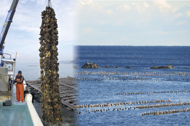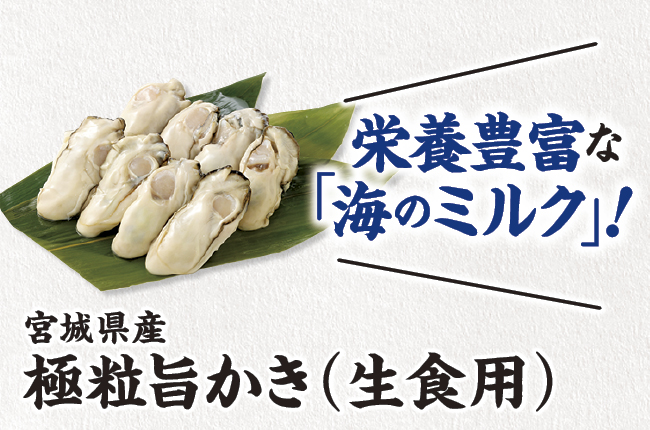 日本でも有数のかき生産量を誇る宮城県は、リアス海岸の入り組んだ海岸線と穏やかな潮の流れが揃っており、かきの養殖において非常に適した環境です。親潮と黒潮がぶつかる潮目は餌となるプランクトンが多く集まるため、それらを食べて育った身はぷっくりと肉厚!そんな良質なかきの中からさらに大粒なものだけを選別しお届けしています。