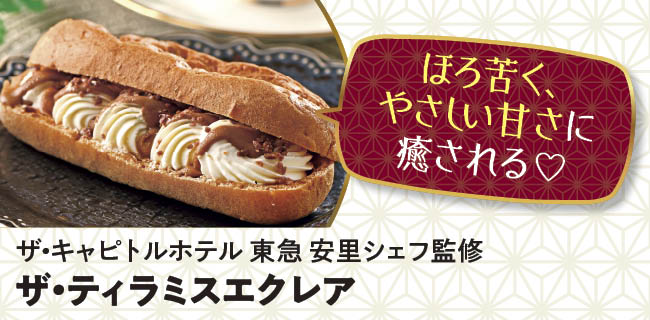 ザ・キャピトルホテル東急の安里シェフが監修した「ザ・ティラミスエクレア」は、ホテルラウンジの上質な味わいを手軽に楽しめる贅沢なスイーツです。さっぱりとしたマスカルポーネクリームに、ほどよい苦みのコーヒーソースを合わせることで、一般的なエクレアと比べてほろ苦さを感じる大人びた味わいが広がります。さらにトッピングのコーヒーキャンディチップが、カリッとした食感と香ばしさをプラス。甘さと苦みのバランスを追求し、開発に1年以上かけて何度も試作を重ねた自信作です。おうちにいながら、まるでホテルのアフタヌーンティーで味わうような、至福のひとときをもたらします。