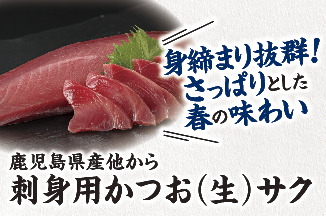 黒潮に乗って北上を始めるかつおは、春だけの特別な味覚。3月中旬から水揚げが始まる初がつおは、すっきりとした味わいとみずみずしい身が魅力です。一本釣りで丁寧に水揚げされたかつおは、魚体に傷がつかず身質も良いのが自慢です。水揚げ後すぐに氷水で冷やし、鮮度を保って店舗へ納品されます。店内で加工することで、鮮やかな赤色とハリのある身を新鮮なままお届け。かつお特有の香りが控えめで、誰でも食べやすい軽やかな味わいは、この季節だけのお楽しみです。