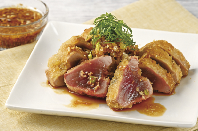 鮮度抜群の生かつおは、表面をさっと揚げたレアカツにするのがおすすめ。外は香ばしく、中はしっとりとした赤身の旨みが広がります。香味野菜をたっぷり使った香味だれをかければ、春らしい爽やかな香りとさっぱりした味わいが絶妙に調和。脂の少ない初がつおならではの軽やかさで、箸が止まらないおいしさです。旬の短いこの時期だけの味わいを、ぜひ食卓で楽しんでみてください。
