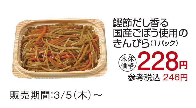 より多くのお客様に親しんでいただける味わいを目指し、「鰹節だし香る国産ごぼう使用のきんぴら」がリニューアルしました。ベースは、国産鰹節と北海道産昆布を使った風味豊かな“鰹節だし”。関東のお客様になじみ深いコクのある味わいが、ごぼうの持ち味を引き立てます。主役のごぼうは国産素材を使用。細切りにすることで、かたすぎずやわらかすぎないほどよいシャキシャキ感を実現しました。味付けはだしの旨みを軸に、ごぼうの風味を残しつつ少量のコチュジャンと胡麻油でアクセントをプラス。最後に油でひと炒めすることで香ばしさを引き立て、だしと胡麻油の香りが重なり合う一品に仕上げました。