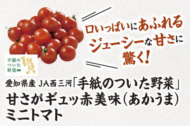 ※パッケージの二次元コードを読むと、甘さがギュッ赤美味(あかうま)ミニトマトの生産者さんからのお手紙が読めます。味の感想などぜひお返事も書いてくださいね!
