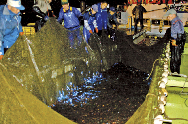 日本海に面した富山湾は、深く急峻な地形が特長です。浜から沖にかけてなだらかに深くなる他の海域と違い、わずか数百メートル沖で急に深海へと落ち込む崖のような地形が広がり、深海で暮らすほたるいかは、夜になると浮上して水面近くに姿を現します。さらに、漁場が港非常に近いため、水揚げから港までの時間が極めて短く、鮮度を保ったまま素早く運べるのが富山湾漁の強み。この瞬間を捉えることこそ、富山湾ならではのほたるいか漁の醍醐味です。