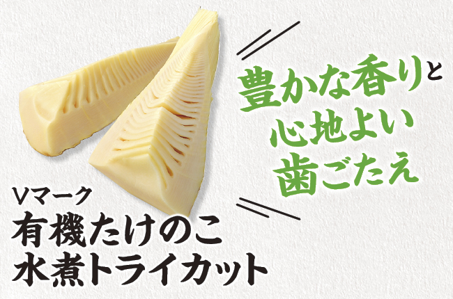お店に並ぶと春を感じるたけのこ。成⻑するスピードがとても早くすぐに⽵になってしまうため、柔らかく美味しいものは今の時期しか⾷べられません。とはいえ⽣のたけのこはアク抜きなどの下処理が⾯倒…という⽅にお勧めしたいのが水煮のたけのこです。細切りやスライスなど、すでにカットされているためお料理に合わせてお選びいただけます。トライカットはお好みのサイズに切ることができ、大きめにするとたけのこのシャキシャキとした心地よい歯ごたえを感じられます。