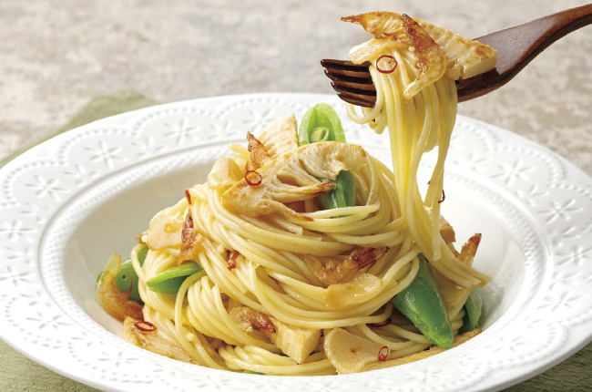 春の香りを楽しむ、たけのこと桜えびのペペロンチーノ